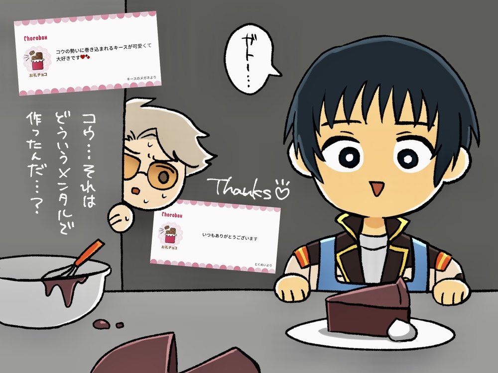 👓「板チョコ二枚持って厨房に向かって行くから、てっきりニナさんにあげるための逆チョコでも作るのかと思ってたんだけど……ケーキが完成したのに、ずっとガトーの名前を呼びながら眺めてるだけなんだ。アイツ、大丈夫かなあ」